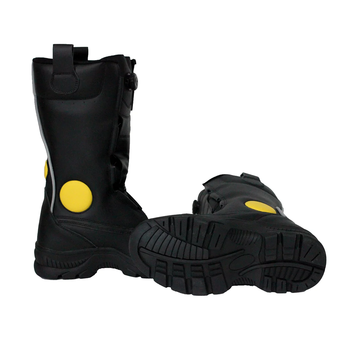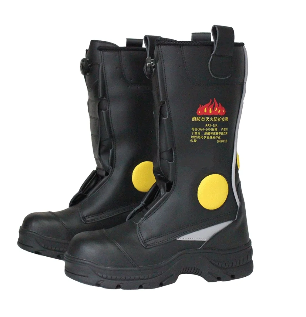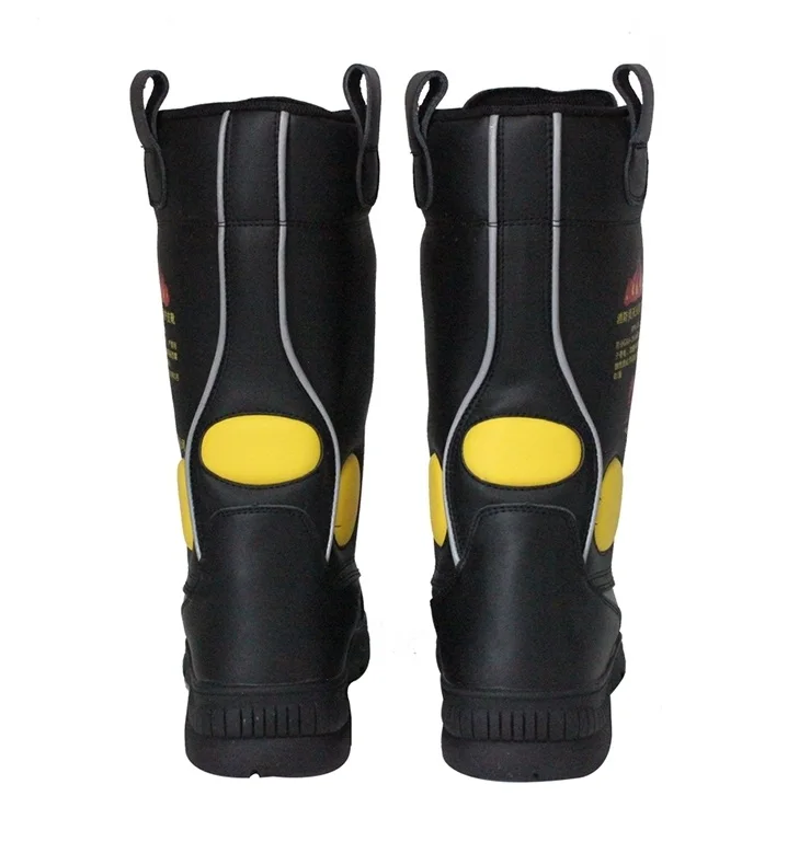 Personal protective equipment for firefighters to protect the feet and calves from water flooding, external force damage and thermal radiation during fire fighting. It is waterproof, anti-puncture, anti-cutting, heat-insulating, anti-radiation and other properties. The color of the main body is black, and the mouth of the boot has a lock protection design.
